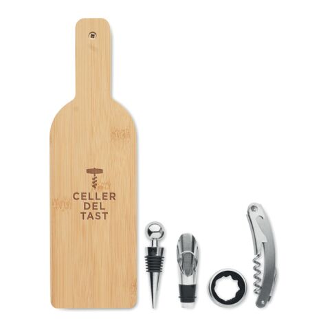 Weinset in Form einer Flasche. Inklusive Korkenzieher, Flaschenverschluss, Weinkragen und Ausgießer. Box aus Bambus.Beliebte Produkte aus der Kategorie Weinsets